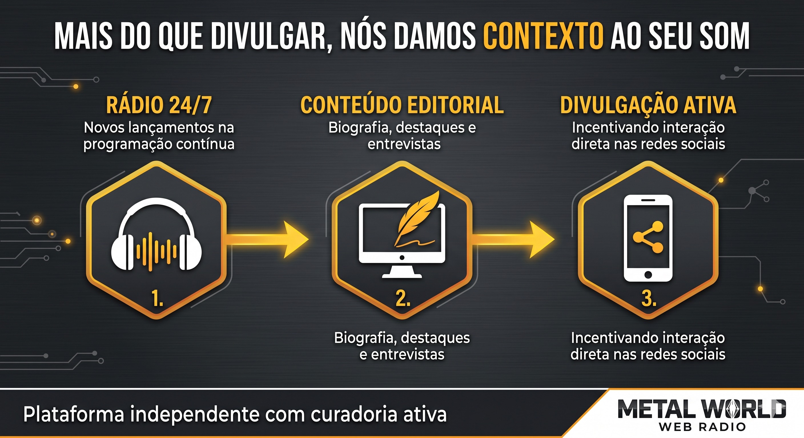 Através da nossa programação 24 horas, conteúdo editorial e do projeto “Bandas que Merecem o Mundo”, apresentamos lançamentos, contamos histórias e damos espaço para que essas bandas encontrem novos ouvintes, especialmente no Brasil, um dos mercados mais intensos e engajados do gênero.